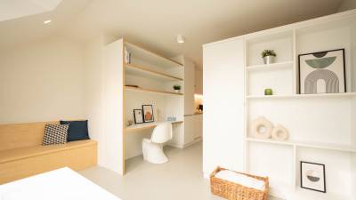 ruime studio met ingebouwde wandkast en uitplooibaar bed. prive sanitair ,dus prive wc, bad/douche, lavabo met warm en koud water. ruimte ...