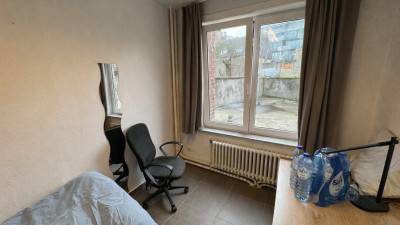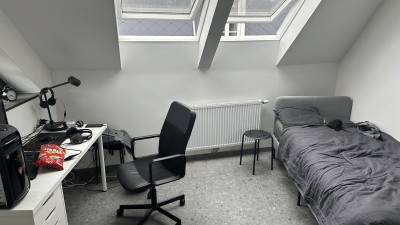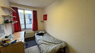 Zonnige gemeubelde studentenkamer op 7de verdiep met koelkast, bureau, zithoek, klapbed 2 pers., badkamer, douche en toilet. 2 gemeenschappe...